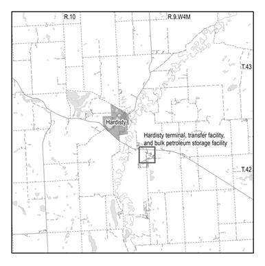 Husky Oil Operations Limited (Husky) operates the Hardisty Bulk Petroleum Storage Facility at Legal Subdivision (LSD) 5, Section 29, Township 42, West of the Fourth Meridian. Gibson Energy Inc. (Gibson) operates the Gibson Hardisty Terminal, Bulk Petroleum Storage Facility at LSD 04-29-042-09W4M and the Hardisty West Bulk Petroleum Storage and Transfer Facility at LSD 08-30-042-09W4M. The facilities are located about 3 kilometres southeast of Hardisty, Alberta (see map below).